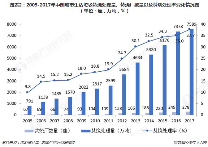 ? ? 和傳統(tǒng)的堆肥、填埋等處理方式相比,焚燒具有處理效率高、占地面積小、對(duì)環(huán)境影響相對(duì)較小等優(yōu)點(diǎn),更能滿足城市生活垃圾處理對(duì)減量化和無害化的要求。并且焚燒處理的方式還能利用焚燒產(chǎn)生的熱能,實(shí)現(xiàn)垃圾的資源化,這些優(yōu)勢(shì)使得垃圾焚燒處理在近些年逐漸得到了較為廣泛的應(yīng)用與推廣。焚燒垃圾場(chǎng)的數(shù)量從2005年的67座增長到2017年的278座,焚燒垃圾處理量由2005年的791萬噸增長到2017年的7589萬噸。焚燒處理率由2005年的9.8%上升到2017年的37.7%。