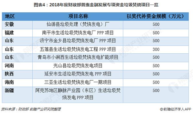 ? ? 針對(duì)目前中國垃圾焚燒處理比例偏低的情況,財(cái)政部通過以獎(jiǎng)代補(bǔ)的方式積極推動(dòng)垃圾焚燒處理項(xiàng)目的發(fā)展,在《關(guān)于下達(dá)2018年度普惠金融發(fā)展專項(xiàng)資金預(yù)算的通知》涉及的20個(gè)生活垃圾處理的項(xiàng)目中,垃圾焚燒項(xiàng)目達(dá)到了9個(gè)。以獎(jiǎng)代補(bǔ)的資金規(guī)模占到全部生活垃圾處理項(xiàng)目的56%。垃圾焚燒項(xiàng)目所涉及地區(qū)即包含東部沿海經(jīng)濟(jì)發(fā)達(dá)省份,又有西北、中部等內(nèi)陸省份。