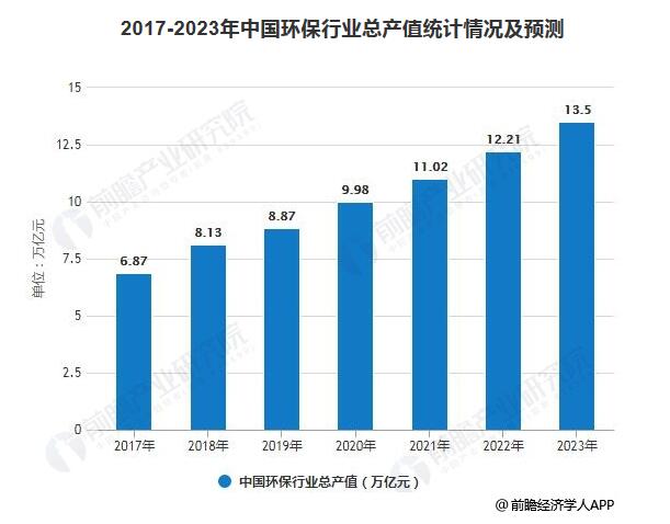 ? ? 據(jù)前瞻產(chǎn)業(yè)研究院發(fā)布的《中國(guó)環(huán)保行業(yè)發(fā)展前景與投資預(yù)測(cè)分析報(bào)告》統(tǒng)計(jì)數(shù)據(jù)顯示,截止至2017年中國(guó)環(huán)保行業(yè)總產(chǎn)值達(dá)到6.87萬(wàn)億元,前瞻初步測(cè)算2018年中國(guó)環(huán)保行業(yè)總產(chǎn)值將達(dá)8.13萬(wàn)億元左右。預(yù)測(cè)2019年中國(guó)環(huán)保行業(yè)總產(chǎn)值將達(dá)8.87萬(wàn)億元。未來(lái)五年(2019-2023)年均復(fù)合增長(zhǎng)率約為11.07%,并預(yù)測(cè)在2023年中國(guó)環(huán)保行業(yè)總產(chǎn)值將接近14萬(wàn)億元。