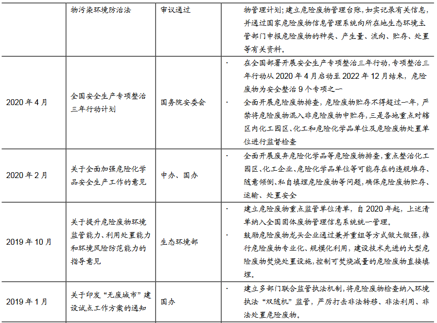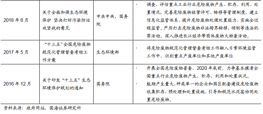 “十三五”以來,從中央到各部委,已出臺多項(xiàng)關(guān)于危廢排查與清單管理、危廢處理處置設(shè)施管理、問責(zé)機(jī)制等體系化政策,此外,環(huán)保督察不斷推進(jìn),逐步由中央下沉至地方,政策層面對危廢量的提升作用明顯。
