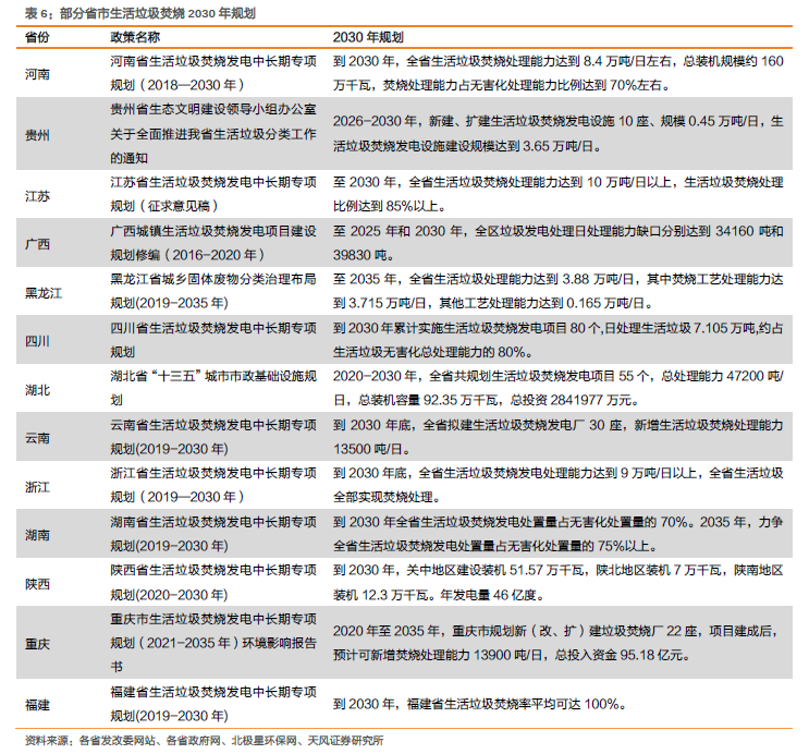 我國(guó)焚燒占比相較國(guó)外仍有較大提升空間,從各省份產(chǎn)能規(guī)劃來(lái)看,未來(lái)5-10年垃圾焚燒產(chǎn)能建設(shè)需求較旺盛。近兩年各省市生活垃圾焚燒中長(zhǎng)期規(guī)劃紛紛出臺(tái),多地明確指出要新增垃圾焚燒廠以提高焚燒處理能力,并設(shè)置了較高的焚燒占比規(guī)劃目標(biāo)。例如江蘇省提出在2022年-2030年新(改,擴(kuò))建垃圾焚燒廠39座,預(yù)計(jì)新增垃圾焚燒處置能力4.5萬(wàn)噸/日;福建省提出到2030年生活垃圾焚燒率平均可達(dá)100%。對(duì)比部分地區(qū)2020年存量產(chǎn)能與2030年規(guī)劃產(chǎn)能,仍有接近兩倍的提升空間,預(yù)示未來(lái)5-10年垃圾焚燒產(chǎn)能建設(shè)需求較旺盛。