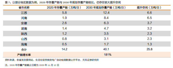 垃圾填埋“新增難+存量減”背景下,垃圾焚燒替代屬性凸顯,產(chǎn)能占比有望進(jìn)一步提升。垃圾焚燒作為垃圾填埋的最主要替代方式,具有占地面積小、處理效率高、環(huán)境污染小、能源利用高等多方面優(yōu)勢(shì)。2020年8月,國(guó)家發(fā)展改革委、住房城鄉(xiāng)建設(shè)部和生態(tài)環(huán)境部等三部委聯(lián)合印發(fā)《城鎮(zhèn)生活垃圾分類和處理設(shè)施補(bǔ)短板強(qiáng)弱項(xiàng)實(shí)施方案》,明確提出“原則上地級(jí)以上城市以及具備焚燒處理能力的縣(市、區(qū)),不再新建原生生活垃圾填埋場(chǎng),現(xiàn)有生活垃圾填埋場(chǎng)主要作為垃圾無(wú)害化處理的應(yīng)急保障設(shè)施使用?!苯刂聊壳埃延卸鄠€(gè)省市提出“原生生活垃圾零填埋”的規(guī)劃目標(biāo),垃圾焚燒替代屬性凸顯。