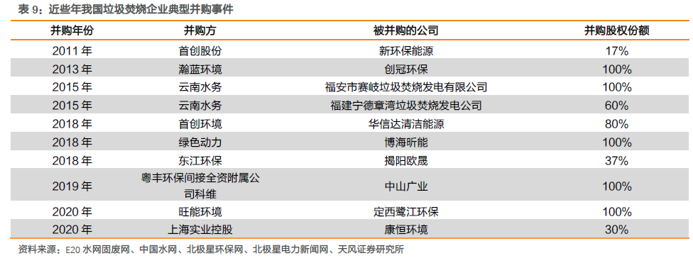 垃圾焚燒企業(yè)加速“跑馬圈地”,在手訂單規(guī)模不斷擴(kuò)大。前些年在一系列政策大力支持下,各城市競(jìng)相建立垃圾焚燒發(fā)電廠,并在國(guó)內(nèi)掀起投資并購(gòu)浪潮。行業(yè)外企業(yè)通過(guò)并購(gòu)快速切入垃圾焚燒領(lǐng)域,行業(yè)內(nèi)企業(yè)借助并購(gòu)迅速擴(kuò)大自身規(guī)模。例如,2011年,水務(wù)領(lǐng)域龍頭首創(chuàng)股份通過(guò)收購(gòu)新環(huán)保能源,將業(yè)務(wù)拓展至固廢處理領(lǐng)域;2013年,瀚藍(lán)環(huán)境收購(gòu)創(chuàng)冠環(huán)保(中國(guó))有限公司100%股權(quán),垃圾規(guī)劃處理能力一年內(nèi)提升四倍。并購(gòu)趨勢(shì)下,龍頭企業(yè)在手規(guī)模不斷擴(kuò)大,截至2019年,在手訂單規(guī)模前十企業(yè)市占率達(dá)55%,前三占有率分別為11/6/6%。
