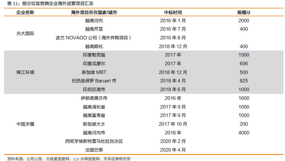 海外拓展穩(wěn)步推進(jìn),龍頭企業(yè)擁有多個(gè)海外運(yùn)營(yíng)項(xiàng)目。隨著國(guó)內(nèi)焚燒設(shè)備及技術(shù)的日漸成熟,國(guó)內(nèi)垃圾焚燒發(fā)電企業(yè)已由早期的技術(shù)引進(jìn)者轉(zhuǎn)向設(shè)備、技術(shù)輸出者,并通過(guò)海外并購(gòu)等方式迅速開(kāi)拓海外市場(chǎng)。目前已有多家企業(yè)擁有數(shù)個(gè)海外投資運(yùn)營(yíng)的垃圾焚燒發(fā)電項(xiàng)目,涵蓋東南亞、歐洲乃至美洲等多個(gè)區(qū)域。