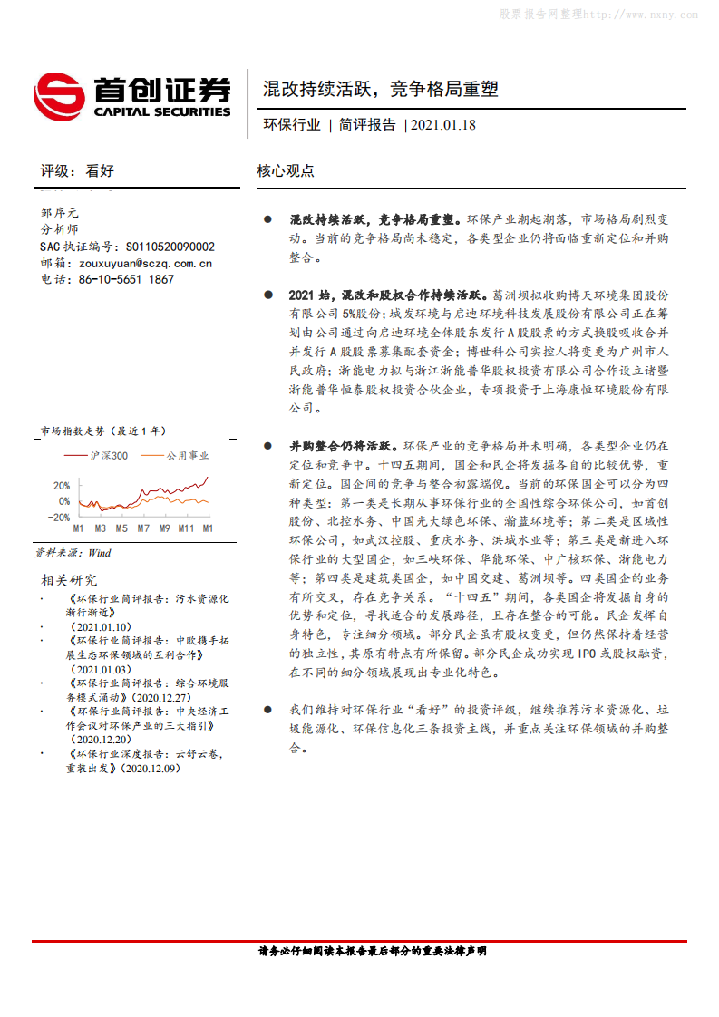 并購整合仍將活躍。環(huán)保產(chǎn)業(yè)的競爭格局并未明確,各類型企業(yè)仍在定位和競爭中。十四五期間,國企和民企將發(fā)掘各自的比較優(yōu)勢,重新定位。國企間的競爭與整合初露端倪。當前的環(huán)保國企可以分為四種類型:第一類是長期從事環(huán)保行業(yè)的全國性綜合環(huán)保公司,如首創(chuàng) 股份、北控水務(wù)、中國光大綠色環(huán)保、瀚藍環(huán)境等;第二類是區(qū)域性環(huán)保公司,如武漢控股、重慶水務(wù)、洪城水業(yè)等;第三類是新進入環(huán)保行業(yè)的大型國企,如三峽環(huán)保、華能環(huán)保、中廣核環(huán)保、浙能電力等;第四類是建筑類國企,如中國交建、葛洲壩等。四類國企的業(yè)務(wù) 有所交叉,存在競爭關(guān)系。“十四五”期間,各類國企將發(fā)掘自身的 優(yōu)勢和定位,尋找適合的發(fā)展路徑,且存在整合的可能。民企發(fā)揮自 身特色,專注細分領(lǐng)域。部分民企雖有股權(quán)變更,但仍然保持著經(jīng)營 的獨立性,其原有特點有所保留。部分民企成功實現(xiàn) IPO 或股權(quán)融資, 在不同的細分領(lǐng)域展現(xiàn)出專業(yè)化特色。