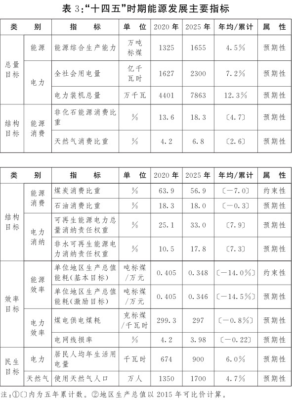 總量目標。到2025年,省內能源年綜合生產(chǎn)能力達到1655萬噸標準煤以上,其中:非化石能源生產(chǎn)能力五年累計提高44%。全社會用電量達到2300億千瓦時以上,年均增長7.2%;人均用電量達到5130千瓦時/人,五年累計提高43%。發(fā)電裝機力爭達到7800萬千瓦以上,五年累計增加79%以上。