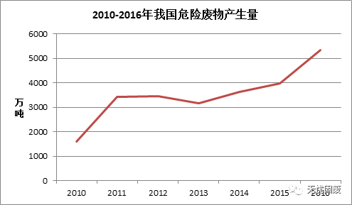 ? ? 工業(yè)行業(yè)是我國(guó)危險(xiǎn)廢物的主要來(lái)源,根據(jù)2017中國(guó)統(tǒng)計(jì)年鑒顯示,2016年全國(guó)工業(yè)危險(xiǎn)廢物產(chǎn)生量為5347.3萬(wàn)噸,同比增長(zhǎng)34.49%。