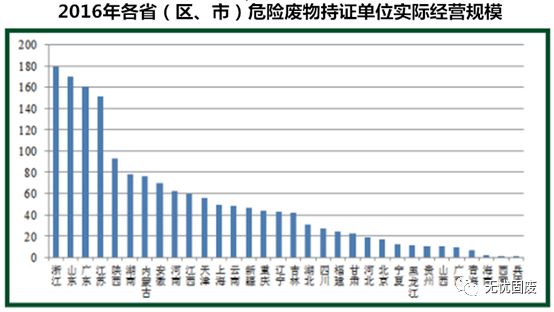 ? ? 截至2016年,全國(guó)危險(xiǎn)廢物經(jīng)營(yíng)持證單位共2195家,核準(zhǔn)經(jīng)營(yíng)規(guī)模達(dá)到6471萬(wàn)噸,平均每家約2.9萬(wàn)噸。但實(shí)際經(jīng)營(yíng)規(guī)模為1629萬(wàn)噸,平均每家不足0.75萬(wàn)噸。實(shí)際經(jīng)營(yíng)規(guī)模排在前三位的分別是浙江、山東和廣東。
