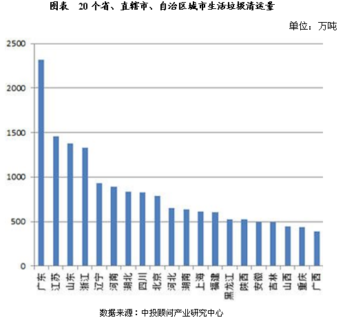 ? ? 廣東省、江蘇省、山東省的生活垃圾清運量位居全國前三位,分別達2320.4萬噸、1456.07萬噸和1377.49萬噸,而浙江省的垃圾清運量僅比山東省少45萬噸,而屈居第四位,其余27個省級行政區(qū)域垃圾清運量均未超過千萬噸大關(guān)。廣東、江蘇、山東、浙江四省的生活垃圾清運量達6486.62萬噸,占全國生活垃圾清運量的33.89%。