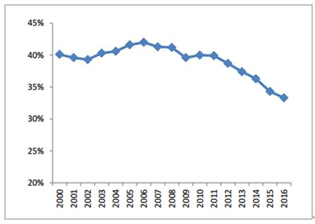 ? ? 環(huán)保投資結(jié)構(gòu)不甚合理,工業(yè)污染治理投資總額增長明顯但占比偏低,與工業(yè)發(fā)展階段相背離。我國工業(yè)仍處于快速發(fā)展階段,2000年以來占GDP的比重一直維持在30%以上的高位,而工業(yè)污染治理投資總額占全國環(huán)境污染治理投資總額的比例自2000年的高點(diǎn)之后卻呈現(xiàn)快速下降及明顯波動(dòng)的趨勢。2000年工業(yè)污染治理完成投資總額234.79億元,占全國環(huán)境污染治理投資總額的23.1%,而到2016年,工業(yè)污染治理完成投資總額819億元,但占比已經(jīng)降至8.9%。這一數(shù)據(jù)表明,在投資拉動(dòng)經(jīng)濟(jì)增長的背景下,以政府支出為主的城市環(huán)境基礎(chǔ)設(shè)施建設(shè)投資在一定程度上擠占了工業(yè)污染治理投資,對(duì)污染物排放占比大的工業(yè)企業(yè)污染治理投入不足,從而加大環(huán)境目標(biāo)達(dá)成的難度。