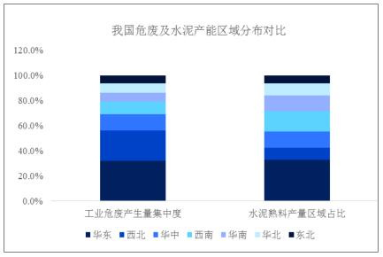 ? ? 區(qū)域分布與危廢產(chǎn)區(qū)高度匹配:水泥在是傳統(tǒng)意義上的“短腿”產(chǎn)品,業(yè)內(nèi)普遍認(rèn)為其經(jīng)濟(jì)銷售半徑為公路<300公里、鐵路<500公里。因此水泥產(chǎn)能的密度與當(dāng)?shù)亟?jīng)濟(jì)發(fā)展水平和基建需求直接相關(guān)。同時(shí),危廢來(lái)自工業(yè)生產(chǎn)過(guò)程,同樣與經(jīng)濟(jì)發(fā)展水平相關(guān)。如下圖所示,水泥產(chǎn)能分布與危廢產(chǎn)量分布情況區(qū)域匹配度整體較高。因此,水泥窯協(xié)同處置工藝的區(qū)域適用性較強(qiáng),適于在全國(guó)范圍內(nèi)推廣,作為普適的協(xié)同處置技術(shù),填補(bǔ)全國(guó)各地傳統(tǒng)危廢產(chǎn)能供需缺口。
