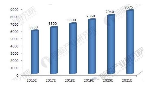 2016-2021年中國工業(yè)固體廢物市場容量預測(單位:億元)