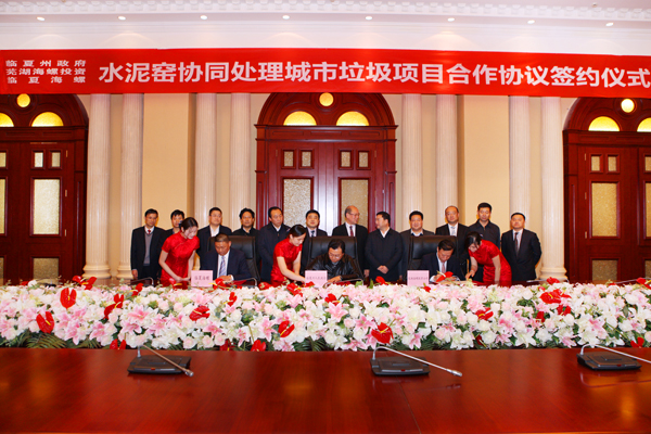 ? ? 在海螺國際會議中心東海廳舉行了臨夏州利用水泥窯協(xié)同處理城市垃圾合作項目協(xié)議簽字儀式,臨夏州副州長魏賀生、海螺創(chuàng)業(yè)總經(jīng)理紀勤應、臨夏海螺董事長秦宏基共同簽署協(xié)議。